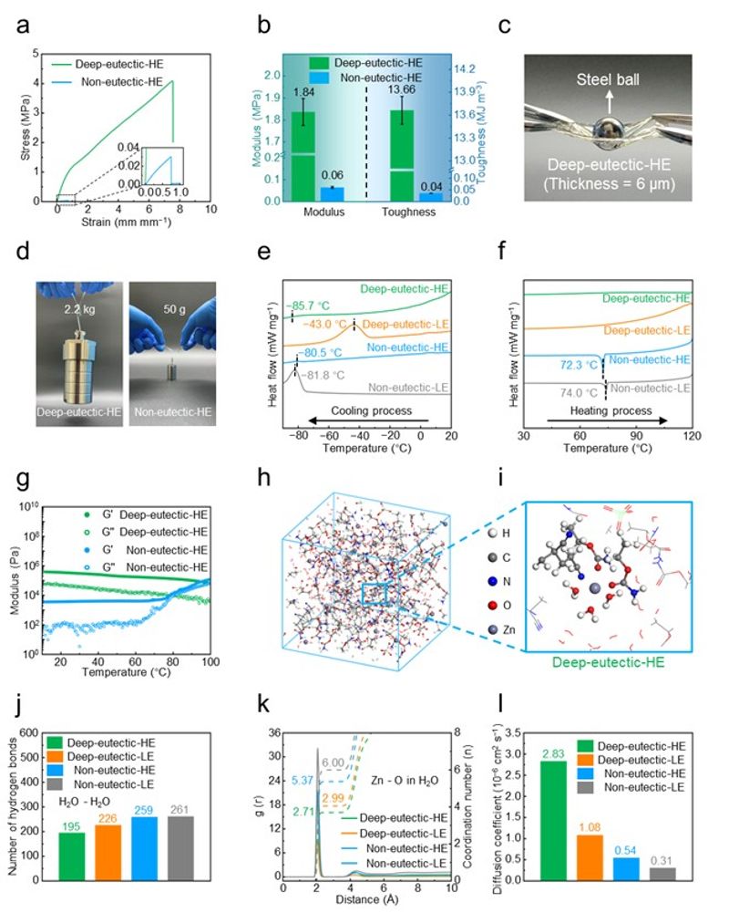 力学性能测试(图2a-b)表明,深共晶水凝胶的断裂应变达752%,断裂强度达4.09 MPa,弹性模量达1.84 MPa,韧性高达13.66 MJ m−3,远超传统水凝胶。得益于纳米相分离工程策略,研究团队成功制备了厚度仅6 μm的超薄深共晶水凝胶膜(图2c),该超薄膜能够承受2.2公斤重物而不破裂(图2d),相较于非共晶水凝胶实现了44倍的负载能力提升。差示扫描量热分析(图2e-f)显示,深共晶水凝胶的玻璃化转变温度低至−85.7 °C,且在20-120 °C范围内未出现任何吸热转变,证实了其优异的低温和高温稳定性。流变学表征(图2g)进一步印证了这一热稳定性,深共晶水凝胶在加热循环中储能模量和损耗模量保持稳定,而非共晶水凝胶因自由水蒸发而逐渐硬化。分子动力学模拟(图2h-j)定量揭示了水分子在不同电解质体系中的受限状态:深共晶水凝胶中水分子间的氢键数量最少,有效抑制了低温冰晶成核和高温脱水导致的结极塌陷。更为关键的是,模拟揭示了Zn2+溶剂化结构的显著变化(图2i, 2k):在非共晶液态电解质中,Zn2+第一溶剂化壳层由6个水分子配位;引入聚丙烯腈后,氰基参与配位使水合数降至5.37;而深共晶体系中,UR的加入使水合数骤降至3以下。这一溶剂化结构的重构使Zn2+扩散系数提升了9倍(图2l),为实现高离子电导率奠定了基础。