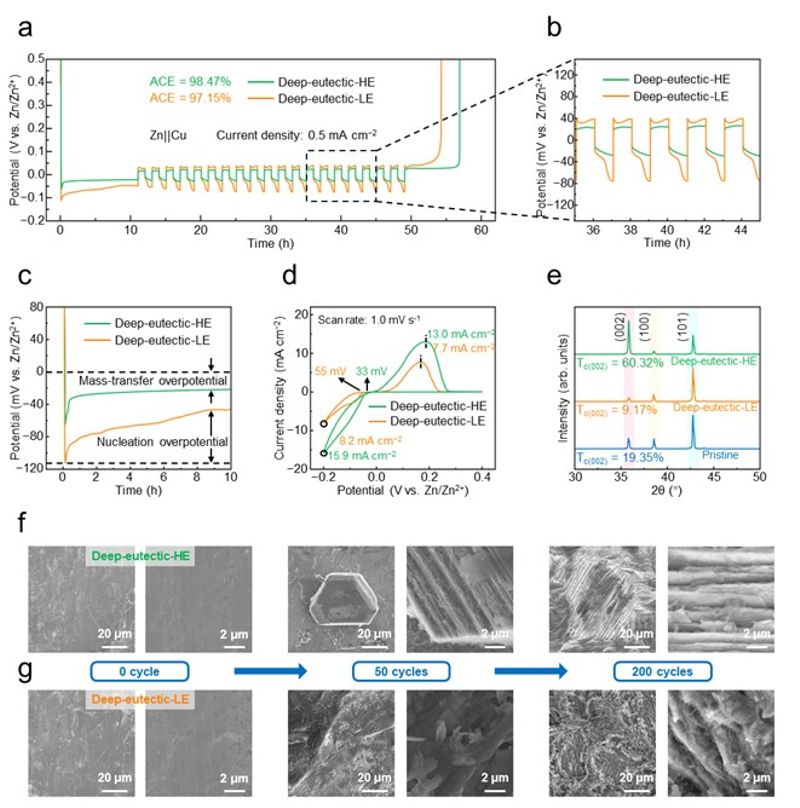 Figure 4.锌沉积/剥离行为。(a-b)分别用深共晶水凝胶电解质和深共晶液态电解质组装的Zn||Cu半电池的(a)电位-时间曲线及(b)其放大视图。(c-d)分别用深共晶水凝胶电解质和深共晶液态电解质组装的Zn||Cu半电池的(c)初始锌沉积过程中的电压曲线和(d)循环伏安曲线。(e-g)从经过锌沉积/剥离过程后的Zn||Zn对称电池中取出的锌电极的(e)X射线衍射图谱以及(f-g)扫描电镜图像:(f)深共晶水凝胶电解质,(g)非共晶液态电解质。