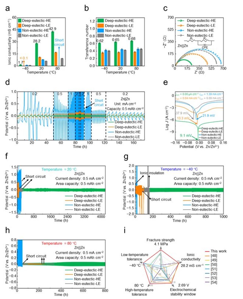 Figure 3.电化学性能。(a)深共晶水凝胶电解质、深共晶液态电解质、非共晶水凝胶电解质和非共晶液态电解质在不同温度下的(a)离子电导率、(b)Zn2+迁移数和(c)界面阻抗。(d-h)Zn||Zn对称电池的(d)倍率性能、(e)Tafel曲线以及在(f)20 °C、(g)−40 °C和(h)80 °C下的恒流循环稳定性。(i)深共晶水凝胶电解质与近期报道的其他水凝胶电解质在断裂强度、离子电导率、电化学稳定窗口和低/高温耐受性方面的性能比较。