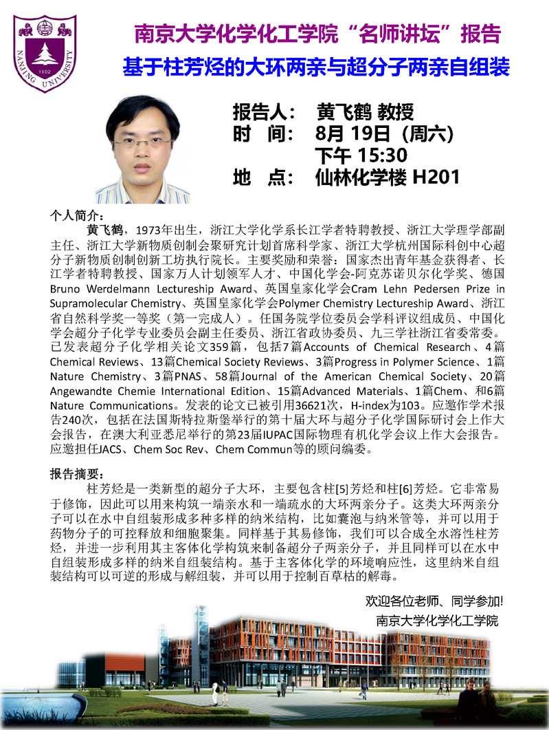 8月19日名师讲坛-黄飞鹤教授:基于柱芳烃的大环两亲与超分子两亲自组装