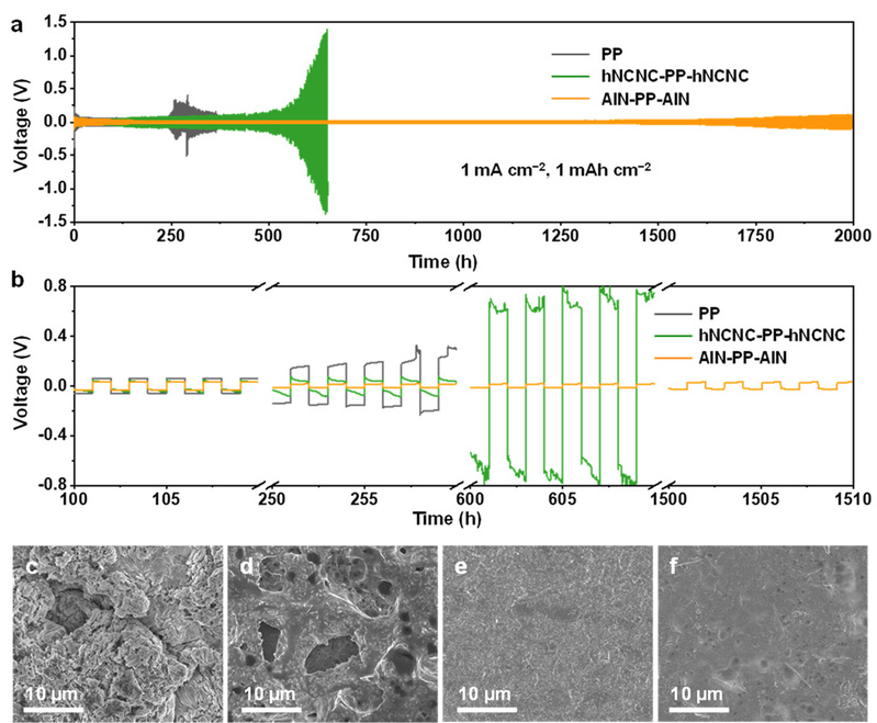 图4揭示了负极侧AlN对锂枝晶生长的抑制作用。Li|Li对称电池结果表明含AlN层的隔膜具有最低的过电位和最长的循环寿命,锂负极表面更加致密平坦,表明AlN层有效地抑制了锂枝晶。