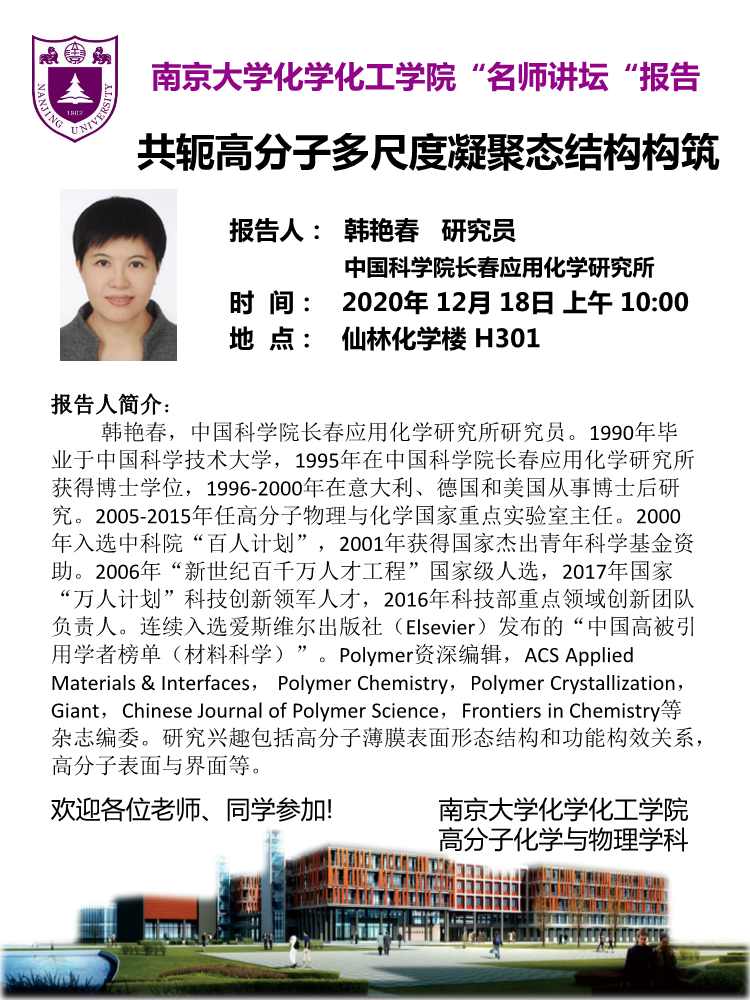12月18日名师讲坛-韩艳春研究员:共轭高分子多尺度凝聚态结构构筑