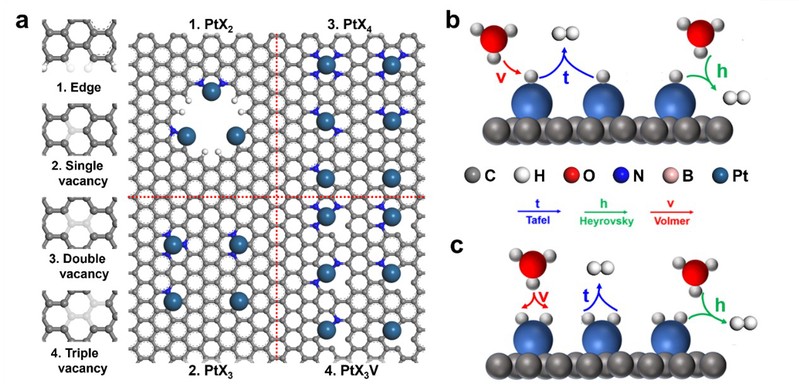 图1 Pt-N-C SSCs的典型结构和可能的HER步骤。(a) Pt-N-C SSCs的结构示意图。(b) 单氢原子吸附时的HER步骤示意图。(c) 多氢原子吸附时的HER步骤示意图。