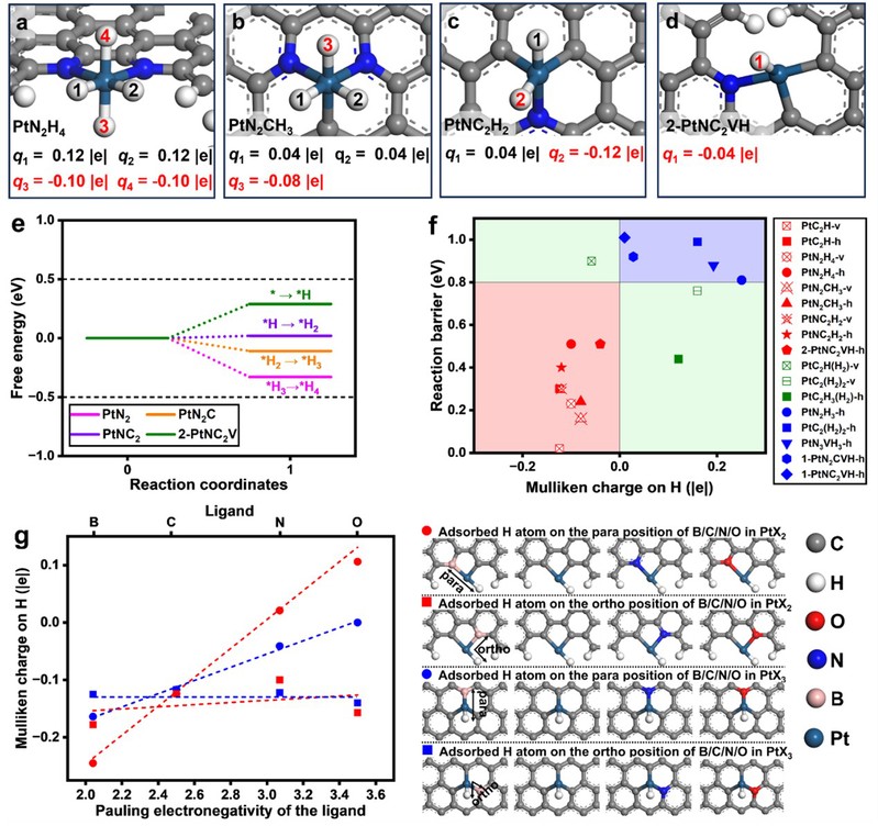 图5 氢气形成能垒与Pt-N-C单位点上吸附氢所带电荷之间的关系。(a-d) 四种高活性结构上吸附氢原子的电荷。(e) 图2-4中Hδ-的吸附能。(f) 氢气形成能垒与该步骤中吸附氢原子所带电荷之间的关系。(g) 配体的鲍林负电性与在其对位/邻位吸附的氢原子所带的Mulliken电荷之间的关系。