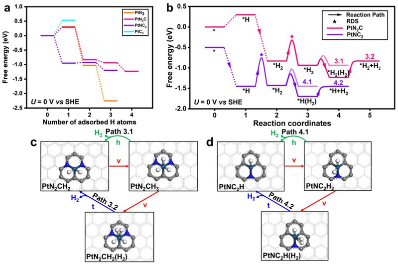 图3 PtX3单位点上的氢吸附结构和HER路径。(a) 多氢吸附过程的自由能曲线。(b) PtN2C和PtNC2上HER路径的ΔG≠。(c-d) PtN2C (c) 和PtNC2 (d) 上的氢吸附结构和HER路径。