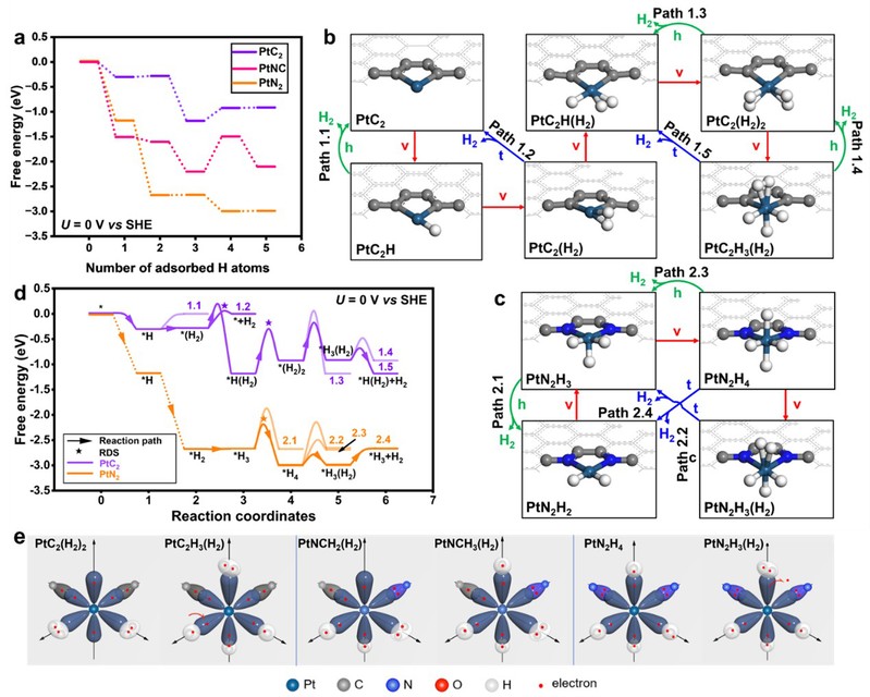 图2 PtX2单位点上的氢吸附结构和HER路径。(a) PtX2单位点上多氢吸附过程的自由能曲线。(b-c) PtC2 (b) 和PtN2 (c) 上的氢吸附结构和HER路径。(d) PtC2和PtN2上HER路径的ΔG≠。(e) PtC2、PtNC和PtN2上典型吸附结构的电子排布。