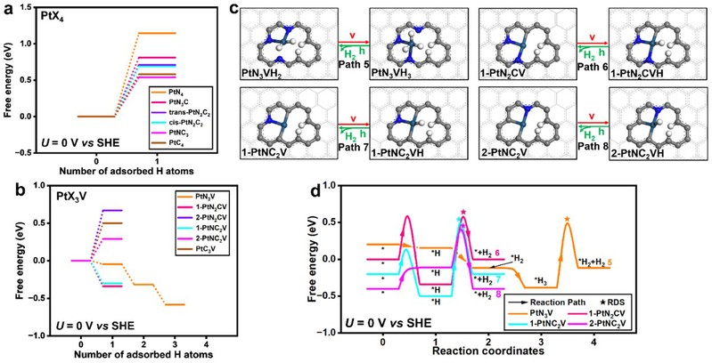 图4 PtX4和PtX3V单位点上的氢吸附结构和HER路径。(a-b) PtX4 (a) 和PtX3V (b)上氢吸附过程的自由能曲线。(c) PtN3V、1-PtN2CV、1-PtNC2V和2-PtNC2V上的氢吸附结构和HER路径。(d) PtN3V、1-PtN2CV、1-PtNC2V和2-PtNC2V上HER路径的ΔG≠。