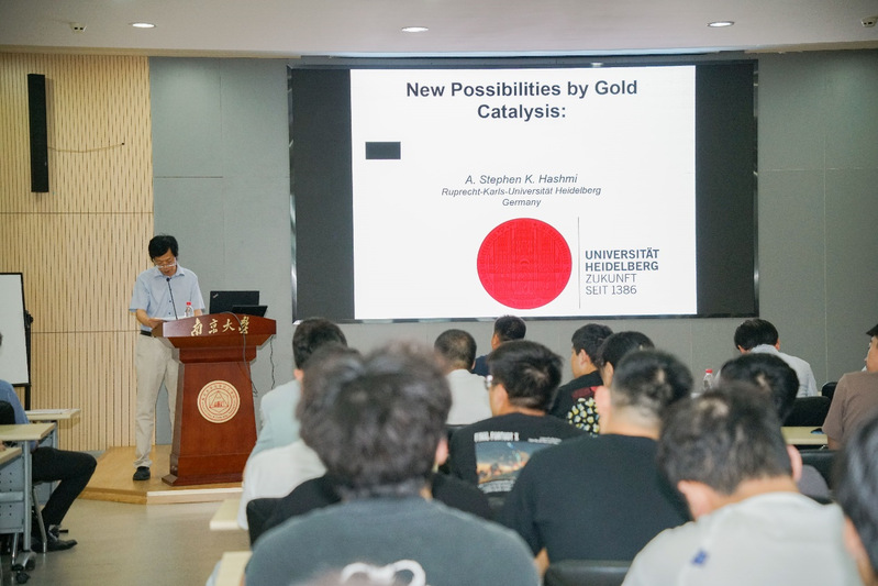 报告开始,A. Stephen K. Hashmi教授首先概述了黄金的发展史,指出了在合成金催化剂以及其催化应用上所面临的限制与挑战。其次介绍了由于金催化剂相比传统贵金属有着独特的对水、氧气的耐受性,近些年引起了合成化学家们的极大兴趣。随后Hashmi教授围绕着金配合物的合成与设计、金催化的反应模式、独特的“π酸性”展开,依次介绍了近些年代表性工作并且详细阐述了金催化反应的机理。最后Hashmi教授对金催化的优势再一次总结并对未来发展方向进行了展望。在讨论环节中,师生们踊跃提问,就金催化的新的发展模式及其前景展开了激烈讨论,大家受益匪浅,报告在热烈的掌声中结束。
