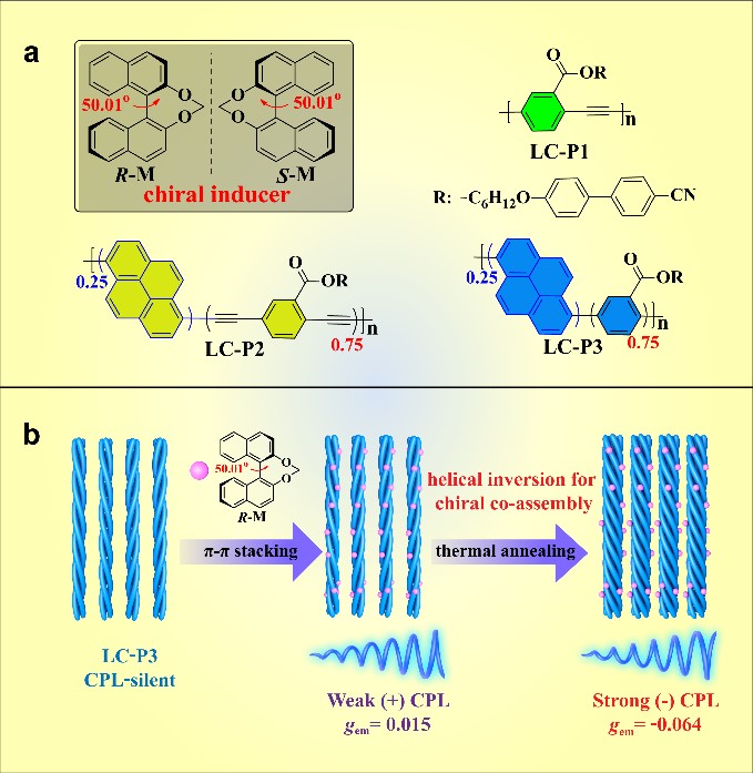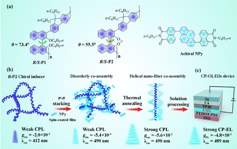 手性超分子组装可以在主客体间形成超螺旋纳米结构,这为发展CPL活性材料提供了新的策略。近日,betway西汉姆联化学化工学院成义祥教授课题组通过使用基于手性共组装液晶材料的热退火来调控CPL发射方向。在该项工作中,选用三种非手性液晶聚合物(LC-P1/P2/P3)和具有固定二面角的手性联萘诱导剂(R/S-M)来构建手性共组装体,通过超分子共组装过程调控纳米纤维螺旋结构排列方向,探索非手性液晶聚合物中芘单元(Py)发射体的CPL行为。该工作发现通过玻璃化转变温度下的热退火处理,手性共组装(R/S-M)0.1-(P3)0.9发出反转的深蓝色CPL信号(λem = 455 nm, |gem| = 6.47 × 10-2, ΦF = 48.5%)。液晶聚合物分子理论计算表明柔性的主链结构LC-P3与手性源可形成有序螺旋纳米纤维,热退火处理下柔性主链更有易于螺旋纳米纤维的构型翻转,从而改变CPL 发射方向。该工作近期在ACS Nano发表(ACS Nano 2022, 16, 3173−3181)。