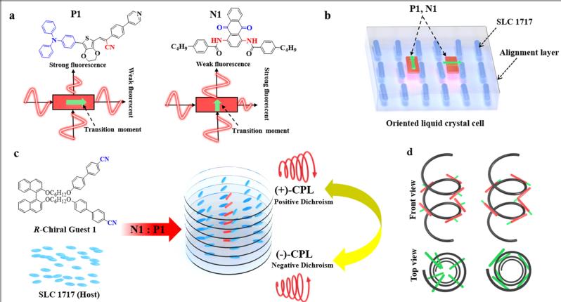 向列相液晶经掺杂手性诱导剂,可自组装成排列规整有序的胆甾相液晶织构,有利于分子间手性传递和手性信号放大效果,逐渐成为一种理想的CPL材料。近日,betway西汉姆联化学化工学院成义祥教授开展非手性二向性荧光分子调控动态CPL液晶材料,通过在向列相SLC1717液晶介质中掺杂手性诱导剂和D-A型非手性二向性荧光染料(N1和P1),热退火处理,成功组装成高级有序的螺旋液晶织构,进一步促进分子间手性诱导能力和非手性二向性荧光分子手性信号放大效应。通过改变N1:P1 的质量比可调控CPL 发射方向和手性强度,不对称因子 (|gem|) 值高达 0.71。这是首例仅通过改变非手性二向性荧光染料分子在胆甾相液晶介质中不同偶极跃迁排列方向调控动态CPL发射方向,该工作近期在Advanced Materials发表(https://doi.org/10.1002/adma.202202309)。
