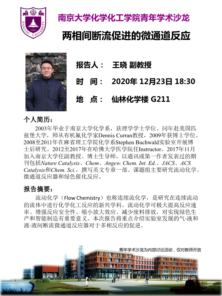 2020年12月23日 | 王晓 | 两相间断流促进的微通道反应 | 18:30 | G211 |