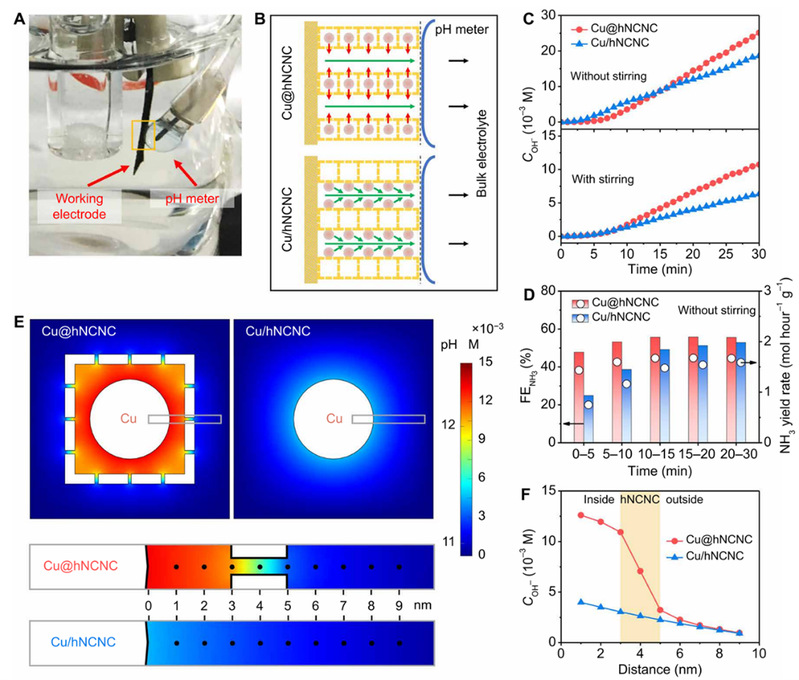 图2. 局域pH检测及模拟。(A、B)pH计法检测OH−的产生和扩散的实物图(A)和示意图(B)。(C)电极表面OH−浓度随时间变化图。(D)不同反应时段的产氨性能。(E、F)笼内外OH−浓度的有限元模拟。