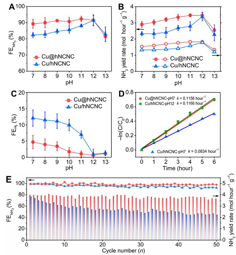 图3. 限域型催化剂和负载型催化剂的产氨性能对比。(A-C)不同pH下的氨法拉第效率(A)、氨产率和分电流密度(B)、氢气法拉第效率(C)。(D)pH 7和12下的一级动力学特征。(E)稳定性。