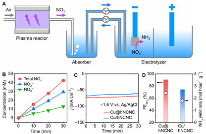 图4. 等离子体氮气氧化-硝酸盐还原耦合系统的可持续制氨演示。(A)耦合系统示意图。(B)硝酸盐/亚硝酸盐浓度随等离子体处理时间变化曲线。(C)恒电压模式下的i-t曲线。(D)产氨性能对比。