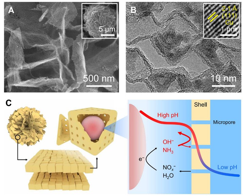 图1. 纳米笼基限域型催化剂形貌及其在反应中自发形成笼内局域高pH环境示意图。