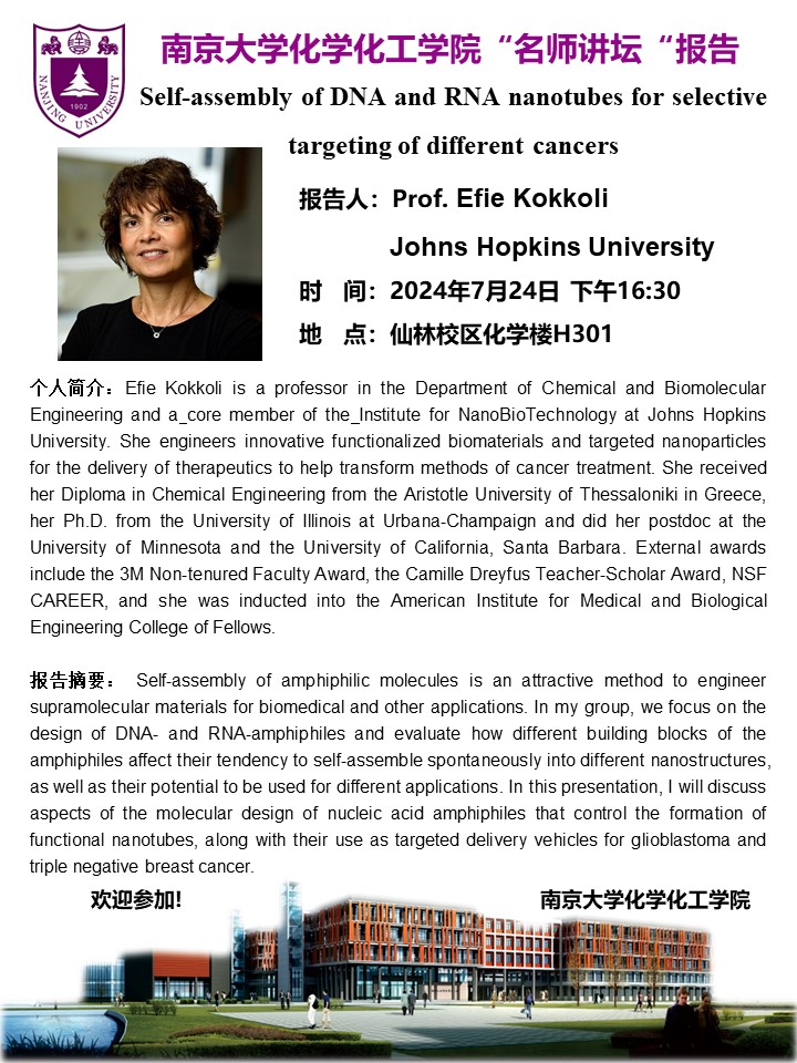 7月24日名师讲坛-Prof. Efie Kokkoli: Self-assembly of DNA and RNA nanotubes for selective targeting of different cancers