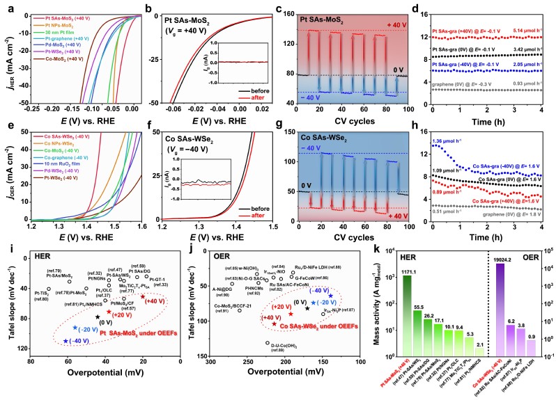 图5.定向电场作用下单原子催化剂的优异性能及稳定性测试