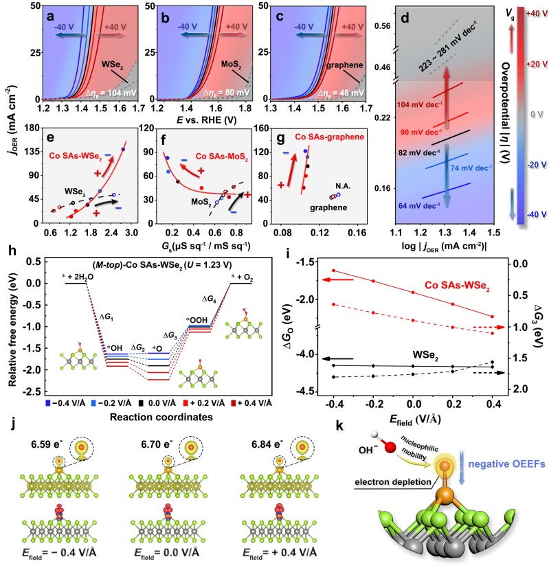 图4.定向电场作用下钴单原子的电析氧测试和Co SAs-WSe2析氧过程的理论计算结果