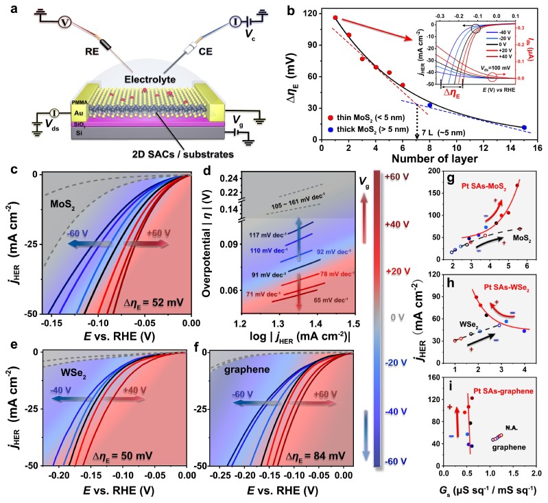 按照上述合成方法在具有不同场效应调控特性的二维基底(n型半导体二硫化钼,p型半导体二硒化钨和类金属型石墨烯)上负载铂单原子,在微纳电化学平台上对其进行HER(还原反应)测试和原位电输运性质分析(如图2所示),并通过施加底栅电压引入定向外部电场。实验结果表明,二维基底的析氢电流密度与薄膜电导呈现正相关性,且该电导是由二维基底中受电场调控的载流子浓度决定的;而负载在不同二维基底上的铂单原子则表现出析氢电流密度与薄膜电导的弱相关性,且均在正向电场作用下实现了电析氢性能的显著提升。由此可推测,电场在单原子电催化体系中的作用机制与场效应晶体管的调控原理存在本质不同,是一种独特的外场调控机制。