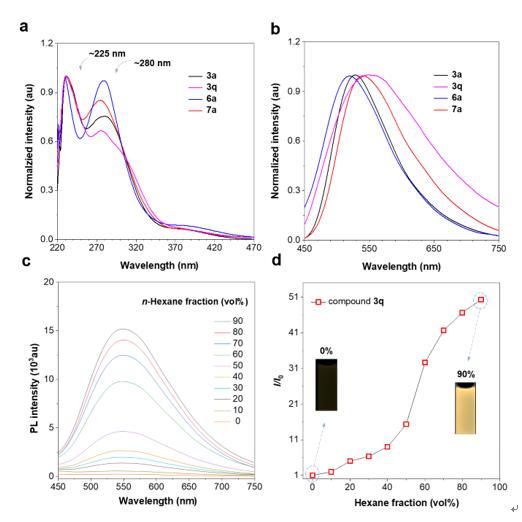 随后,对几个典型的化合物进行了光物理性质的研究。研究表明三维碳硼烷笼能够削弱整个分子的共轭,因此表现出在溶液中几乎不发光,且在固态下发光增强的性质。对晶体结构的研究和理论计算同样佐证了这一观点。同时,碳硼烷C-C键的振动可能对溶液中的发光淬灭造成了一定的影响。