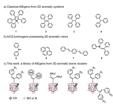 图1. 经典的AIE分子、ACQ分子和新型基于三维碳硼烷笼的AIE分子