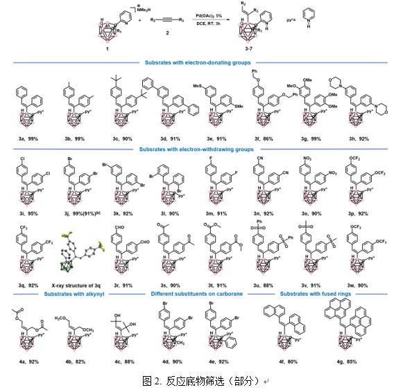对于二苯乙炔类型的底物,无论苯环上带有吸电子取代基还是给电子取代基都可以以很高的收率得到B(11)位点的B-C偶联产物。当Br原子位于苯环的邻位、间位、对位时,都能以很高的产率得到产物。值得注意的是,该反应对官能团的兼容性很强,且对含有活泼氢的底物也可以兼容,例如-SMe, -NR2, -CN, -NO2, -CHO, -CO2Me, -SO2Me, -OH 和-OCF3等官能团都适用于该反应,大大提高了反应的应用价值。对于烷基取代的乙炔,也可以获得良好的产率。将巢式碳硼烷的碳端取代基更换为甲基或者苯基,也能获得很高的产率(图2)。同时,该反应对有机光电材料中经常出现的骨架、杂环类二取代乙炔也有着很好的兼容性,和含噻吩、苯并噻吩、喹啉、呋喃、苯并呋喃、咔唑、苯基咔唑等基团的二取代乙炔反应都能有很好的产率。该反应对不对称二取代乙炔也有很好的位置选择性,并以很高的分离产率得到产物。增加乙炔原料用量和反应时间,能高产率得到B(2)位点和B(11)位点二取代产物。