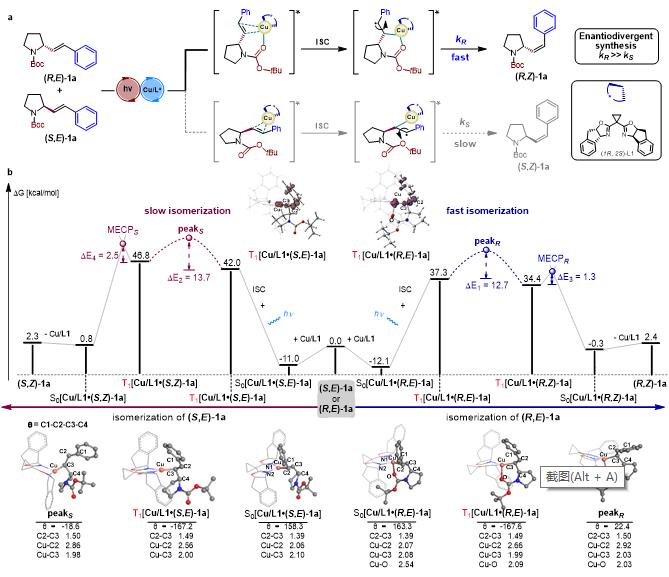 受到手性过渡金属配合物(镍、铜、铑、铱等)能够作为激发态不对称催化的光敏剂和手性控制剂的启发,以及最近关于铜配合物能够有效促进烯烃化合物E → Z异构化的报道,betway西汉姆联俞寿云课题组(实验部分)近期与曲阜师范大学袁相爱团队(理论计算部分)合作,发展了一种基于光激发手性铜配合物介导的对映选择性E → Z异构化策略,成功实现了一系列外消旋2-苯乙烯基吡咯烷衍生物的动力学拆分。机理验证实验和DFT计算表明,底物−催化剂复合物的两个对映体总体敏化速率的不同,是该异构化过程具有优异动力学拆分效率的决定性因素。该方法进一步拓展了动力学拆分的基态反应模式,为激发态对映选择性催化过程提供一个新的思路。相关文章以Photoexcited Chiral Copper Complex-Mediated Alkene E → Z Isomerization Enables Kinetic Resolution为题发表于J. Am. Chem. Soc. DOI: 10.1021/jacs.2c04040。betway西汉姆联张昊博士为论文第一作者,俞寿云教授和袁相爱副教授为共同通讯作者。