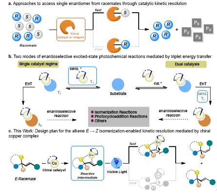 由于特定烯烃分子的不同异构体(E/Z异构体、对映异构体)对手性受体识别的不同,往往在宏观上表现出不同的物理、化学以及生物学特性。基于此,如何超越生物合成模式的限制,实现烯烃化合物构型的有效控制一直以来都是有机立体化学的重点研究内容。目前,Gilmour、Weaver和俞寿云等课题组利用可见光介导的选择性能量转移策略有效地克服了微观可逆性和基态热力学限制所带来的不利影响,已经能够较好地解决简单烯烃E → Z的有效配置。但是对于三维空间的对映选择性异构化过程来说,则仍然具有十足的挑战。在过去的几十年里,不对称合成已逐步成为构建多样化对映体富集分子的强有力工具。而外消旋混合物的动力学拆分过程,同样也是一种获得手性化合物的成熟策略。