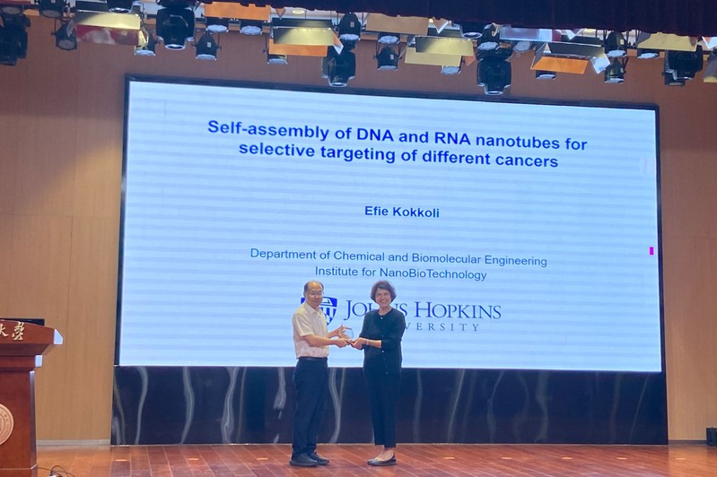 Efie Kokkoli is a professor in the Department of Chemical and Biomolecular Engineering and acore member of theInstitute for NanoBioTechnology at Johns Hopkins University. She engineers innovative functionalized biomaterials and targeted nanoparticles for the delivery of therapeutics to help transform methods of cancer treatment. She received her Diploma in Chemical Engineering from the Aristotle University of Thessaloniki in Greece, her Ph.D. from the University of Illinois at Urbana-Champaign and did her postdoc at the University of Minnesota and the University of California, Santa Barbara. External awards include the 3M Non-tenured Faculty Award, the Camille Dreyfus Teacher-Scholar Award, NSF CAREER, and she was inducted into the American Institute for Medical and Biological Engineering College of Fellows.