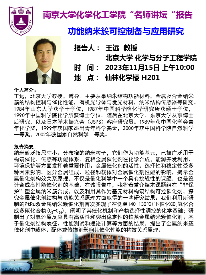 11月15日名师讲坛-王远教授:功能纳米簇可控制备与应用研究
