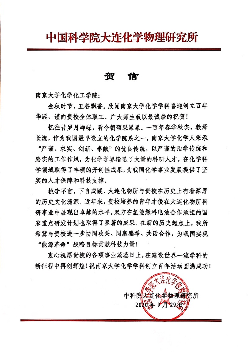 大连化学物理研究所贺信