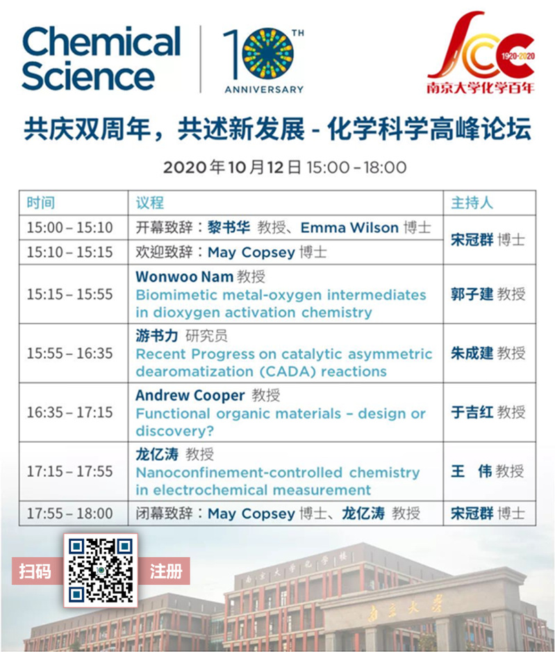 此外,为庆祝南大化学百年和Chemical Science 创刊十周年,英国皇家化学会与betway西汉姆联化学化工学院共同策划于10月12日举办化学科学在线高峰论坛,邀请来自betway西汉姆联化学化工学院和Chemical Science的全球领军化学科学家,共庆双周年,共述新发展!