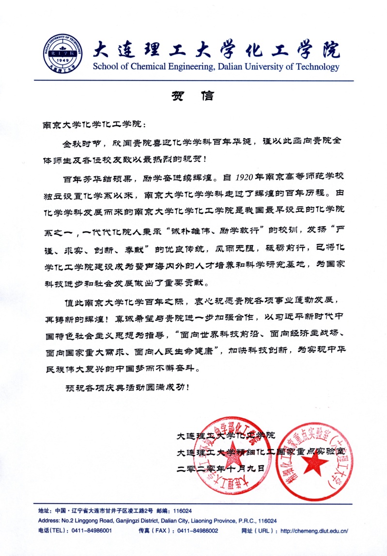 大连理工大学化工学院贺信