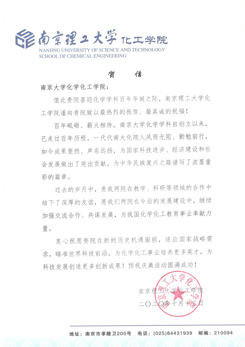 南京理工大学化工学院贺信