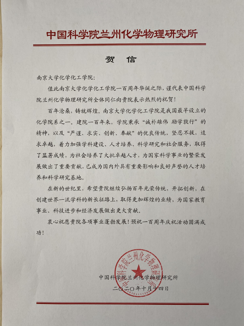 中国科学院兰州化学物理研究所贺信