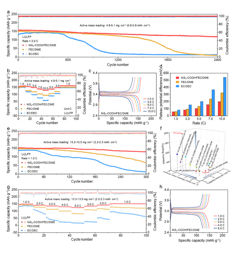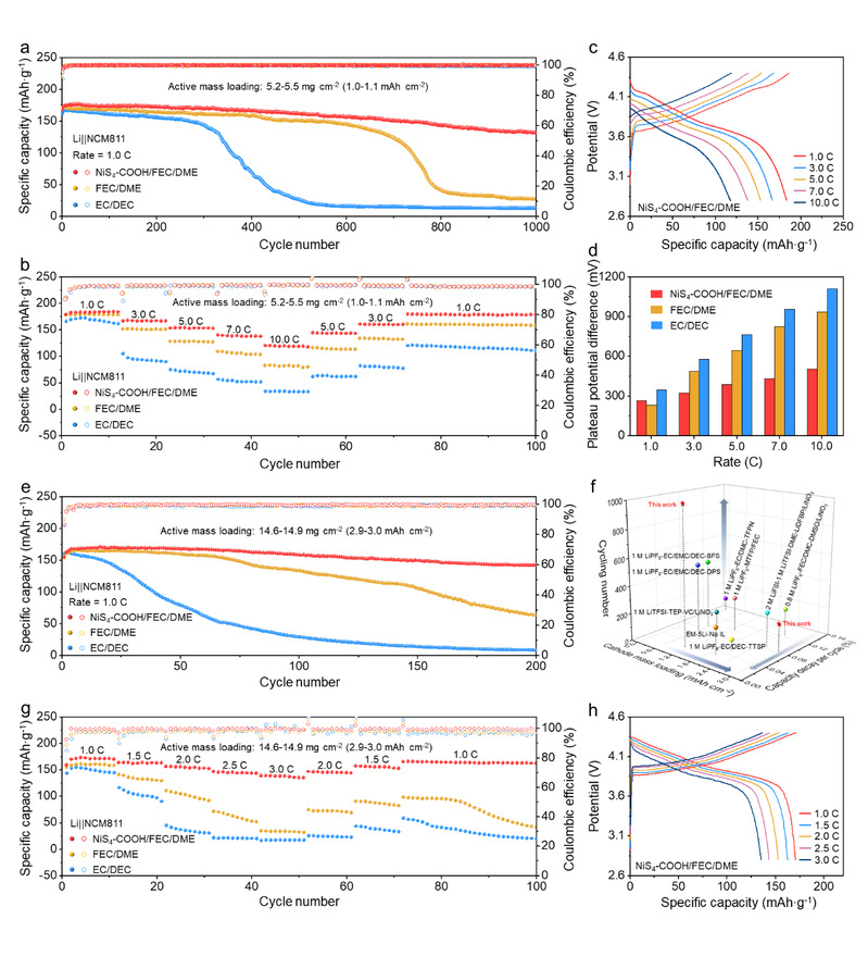 得益于NiS4-COOH添加剂对于锂沉积行为的调控和对于锂离子溶剂化结构的优化,基于改性电解液的Li||LFP和Li||NCM811电池表现出优异的循环稳定性和倍率性能。即使在正极高负载条件下,Li||LFP和Li||NCM811电池也能稳定循环,并保持高的库伦效率和容量剩余。相比于已报到的同类型工作,NiS4-COOH添加剂改性电解液也展现出极强的竞争性。