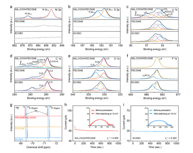 总之,通过在含氟酯醚混合电解液中引入一种精心合成镍二硫烯分子作为多功能添加剂,开发出了一种精心设计的电解液,该电解液与 LMA 和侵蚀性阴极具有很高的兼容性。实验证明,由于羧基官能团与锂金属之间的反应,NiS4-COOH 添加剂能够自发地锚定在锂金属表面,形成 SALI。SALI 具有丰富的 镍二硫烯亲锂位点,可有效降低锂的初始沉积过电位,并调节锂的均匀电沉积。此外,由于不饱和镍原子与带负电荷的 PF6- 阴离子之间的相互作用,NiS4-COOH 添加剂能够显著改变电解液中离子的配位环境,从而有利于抑制 PF6- 分解、优化 SEI 成分和加速锂离子转移。得益于 NiS4-COOH 添加剂的显著优势,NiS4-COOH/FEC/DME 使对称电池在大电流密度下实现了稳定的循环。采用 NiS4-COOH/FEC/DME 电解液的Li||LFP电池即使在 2400 次循环后也能实现超高的 CE 和容量保持率。当与高电压、高负载的 NCM811 正极配对时,NiS4-COOH/FEC/DME 电解液仍然表现出色,展现出优异的电化学动力学性能和出色的循环稳定性。