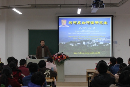 3月1日晚,中科院院士、香港中文大学吴奇教授应邀来公司讲学,为公司师生带来一场思想盛宴。讲座在公司仙林校区逸B212教室举行,参加讲座的有化学化工公司党委纪勇副书记,匡亚明学院葛欣副经理、乔蔚虹副经理,以及来自化院、匡院等各院系的二百多位同学,离讲座开场还有半个小时现场就早已济济一堂,一座难求。