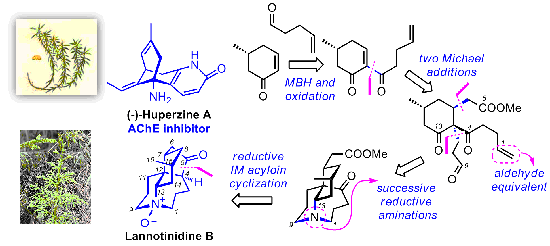 石松门(Lycopodiophyta)是现存最古老的维管植物,并包含一些最原始的现存物种,出现于约四亿一千万年前。石松目(Lycopodiales)是石松植物门的一目,草本,现存有石松属和舌叶蕨属。石松属约250种,中国约有60种。中国民间用某些种的全草作药用,能祛风湿,舒筋活络。石松类生物碱(Lycopodium alkaloids)是从石松属植物(Lycopodium japonicum)和其近缘植物中分得的结构类似,具有相同生源的一类结构奇特且骨架变化多样的生物碱。该类生物碱具有很多重要的生物学功能,其中具有代表性的石杉碱甲(huperzine A)对治疗老年痴呆症有显著疗效,目前正在进行第三期人体临床实验。由于该类生物碱具有新颖复杂的化学结构和重要的生物功能,对于这些天然产物的合成研究已经成为近十年内国际有机合成领域的关注热点。 betway西汉姆联化学化工学院姚祝军教授指导的研究组最近针对huperzine A、Lannotinidine B等石松生物碱开展了系统的化学合成研究,并取得了重要进展。该实验实研究人员针对这些天然产物的个体特点分别设计了合成路线,并从中发现和获得了一些行之有效的立体控制和区域控制的高效率有机合成方法。2012年年初,该研究组博士生丁小华等首次实现了高光学纯度天然石杉碱甲的催化不对称形式合成,通过多功能有机小分子催化一锅构建了石杉碱甲结构中的复杂复杂桥环体系,在克级规模的实验中获得产品达到了95% ee的光学纯度 (Ding, X.-H.; et al. Tetrahedron 2012, 68, 6240-6248)。与此同时,该实验室的访问学者、本校生命科学院副教授戈惠明博士和化院博士研究生张兰德等在另一复杂石松生物碱Lannotinidine B的全合成中也取得了重要进展。今年8月初,他们完成的首例Lannotinidine B的全合成在国际重要学术刊物《美国化学会志》(JACS)上正式发表 (Ge, H. M.; et al. J. Am. Chem. Soc. 2012, 134, 12323-12325.)。该合成路线设计精巧,从商品化原料出发仅使用了十步化学反应,总产率达到23%。合成过程中有效利用了有关化学反应的区域选择性和立体选择性,没有一次使用保护基,并发展应用了羰基-酯基之间直接形成C-C键的自由基还原/负离子环合方法。