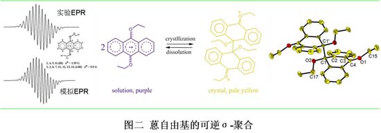 ![]() 王新平教授课题组的博士生陈小雨同学利用弱配位阴离子的保护作用,稳定了一系列烷氧蒽的自由基阳离子,其特征和稳定性被顺磁共振谱所证实。晶体结构解析(由李一志教授完成)发现在固态中自由基通过σ-偶合形成一个二聚体阳离子,在实验上支持了聚合物的自由基聚合机理。另外还发现这类二聚是一个可逆过程(图二)。马晶教授课题组的博士生王兴勇同学通过理论计算支持了以上实验结果。 该项工作为人们研究自由基可逆聚合机理提供了一个良好的分子模型,也为可控制备具有功能特性的聚合物研究展示了一条新思路。