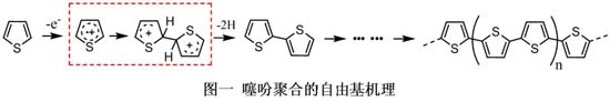 自由基是许多化学反应的中间体,一般活性很高,寿命较短。自由基存在两种聚合方式。一种是π-π聚合,在很多已经报道的并经过晶体结构分析的自由基二聚体均是π-二聚体。另外一种是σ键聚合,是自由基聚合机理的一个重要步骤。以噻吩聚合为例(图一),单体经过氧化作用(化学氧化或电化学氧化)失去一个电子,产生的自由基阳离子迅速通过电子配对形成一个σ单键,成为正二价二聚体,然后失去两个氢原子,得到中性二聚体。如此循环演绎,最后形成聚合物。 因此,稳定单体自由基及其二聚体阳离子可以有效控制聚合过程。然而由于这些中间体的高度化学活泼性,σ-二聚过程 (图一红框部分)在实验上缺乏强有力的证据。