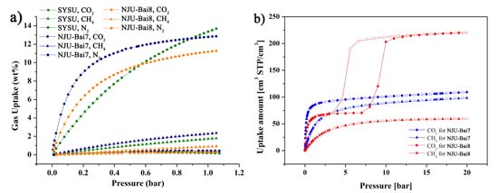 图2. 在298 K温度下,SYSU, NJU-Bai7和NJU-Bai8对二氧化碳,氮气和甲烷的吸附曲线。 a)0-1 bar;b)0-20 bar。