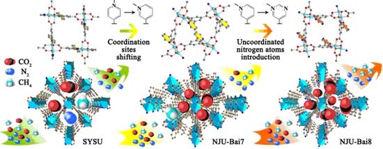 图1. 通过转移配体的配位点调节孔尺寸以及引入不配位氮原子改变孔道极性的策略, 显著地提高了金属有机骨架化合物对二氧化碳的选择性