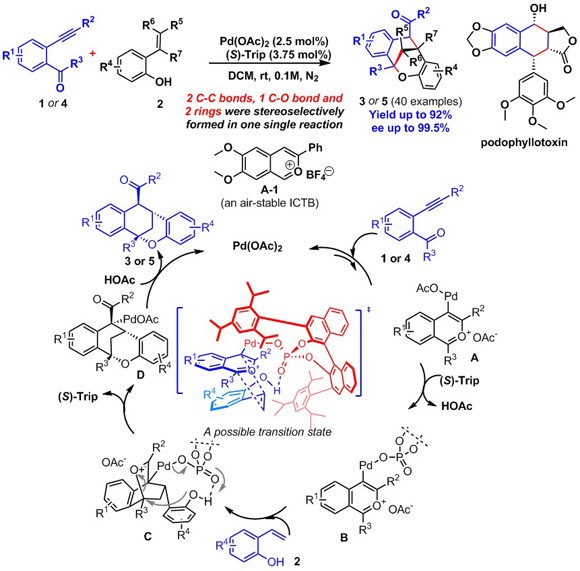 合成效率最优化是提高合成经济性之关键,更是有机合成研究的永恒主题。依据基元反应机理和动力学因素设计、发展和应用各种串联反应正是基于提升合成效率的考虑。高效的串联反应不仅在化学基础层面展示形成多个共价键过程中各基元反应艺术般的“美妙合奏”,而且在包括天然产物在内的各类重要产品的合成与生产中体现无与伦比的实用价值。化学化工学院姚祝军教授指导的研究组近年来根据其在天然产物Chlorofusin等合成中发现的化学转化效率不稳定问题(Qian, W.-J.; et al. J. Am. Chem. Soc.2007, 129, 6400; Yao, Y.-S.; et al. J. Org. Chem. 2008, 73, 5221),持续研究了一类具有非经典弱休克尔芳香性的活泼中间体,即苯并异吡喃氧鎓离子(Isochromenylium)的化学特性,从中相继发展了多种不同寻常的高效率碳正离子型串联反应(Hu, Z.-L.; et al. Org. Lett.2009, 11, 4676; J. Org. Chem.2009, 74, 8787; Chem. Eur. J.2011, 17, 1268; Yu, S.-Y.; et al.; Tetrahedron Lett.2012, 53, 2765; Zhang, H.; et al. RSC Advance2012, 2, 5101.),为合成和制备多种具有多取代四氢萘核心结构的化合物提供了“一步法”捷径。