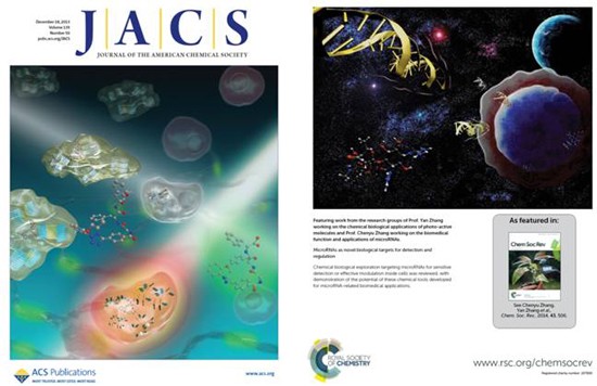 此外,该课题组还通过与公司生命科学院张辰宇教授研究团队的合作,积极探索由光活性分子的反应获取的新结构化合物在调控细胞内microRNA这一前沿研究方向上的应用。目前他们已经从基于光活性分子反应的新结构化合物中筛选得到了几类有重要调控活性的化学小分子。基于这些活性小分子构建探针开展的化员工物学研究也属于目前该领域研究的前沿,张艳教授和张辰宇教授就microRNA作为新型生物靶标的化员工物学研究撰写的综述也作为2014年第二期的封底(图3右)发表于颇具影响力的化学综述杂志 ( Chem. Soc. Rev. 2014, 43, 506-517)。 ![]() 图3 课题组所发表的封面及封底文章