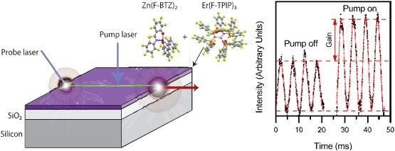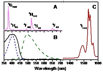 现代远程电子通讯以世界范围的光缆为基础,由于数据损失,需要通过掺铒的光纤放大器(EDFAs)来弥补光纤信号的衰减。但由于铒离子自身的吸收非常弱,EDFAs 需要沿着10-30米长的掺铒光纤轴向放置分离的泵浦激光器来实现粒子数反转,从而实现光增益。这既需要高能泵浦激光器,又不能将掺铒激光器的不同部件集成到同一基底上,这使得掺铒激光器笨重而昂贵。虽然敏化铒发光的研究工作已经进行多年,但一直未能制备出集合多种性能的适用材料。因为在大多数有机物中会出现CH或OH振动能量损失,铒离子的发射会被淬灭,从而使量子效率非常低。