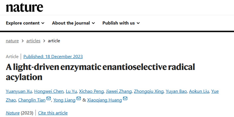 betway西汉姆联化学化工学院黄小强特聘研究员,与化院梁勇教授、中国科学技术大学/中国科学院强磁场科学中心田长麟教授合作,开发了焦磷酸硫胺素(ThDP)依赖酶和光催化协同的双催化新体系,该体系是自然界中全新的、现有化学方法难以实现的全新分子生化体系,不仅极大地扩展了酶的催化功能、为绿色生物制造提供了丰富元件,还为化学领域的手性精准控制难题提供了新策略,有望引领光生物制造新方向。成果以“A light-driven enzymatic enantioselective radical acylation”为题,2023年12月18日在线发表于Nature期刊,论文链接:https://www.nature.com/articles/s41586-023-06822-x。