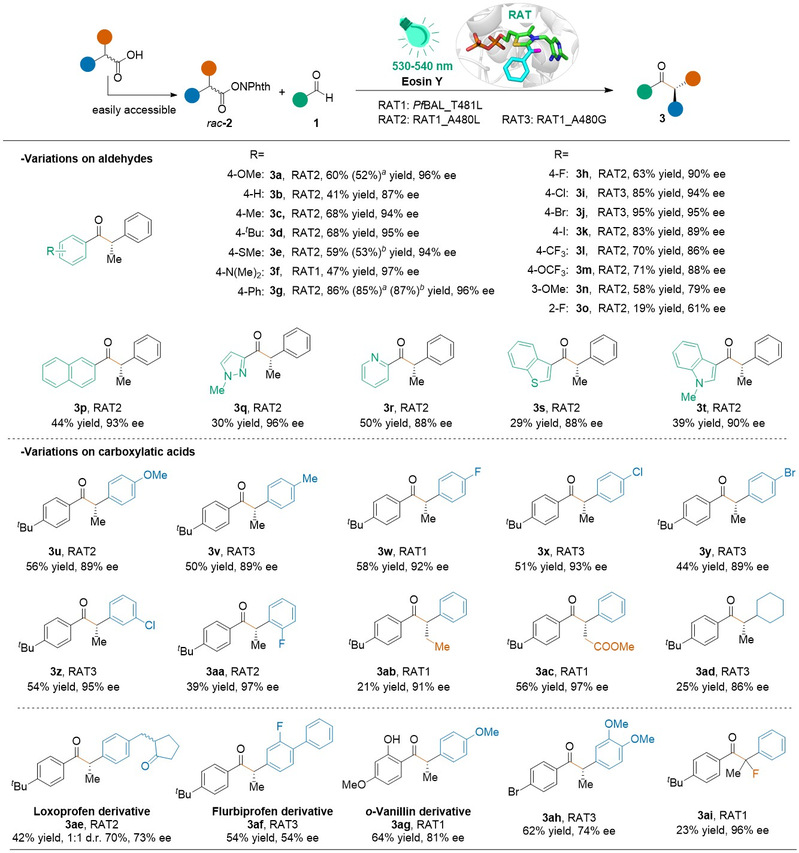 团队以4-甲氧基苯甲醛1a和自由基前体氧化还原活性酯2a作为模板底物,探索了有机染料曙红Y和ThDP依赖酶的催化体系。随后通过分子动力学模拟和半理性设计构建了小而精的突变体库,能够快速、低成本地获取最优突变体酶。该体系有非常好的底物耐受性,能够接受的底物包括各种邻、间、对位取代的芳香醛、杂环芳香醛和各种取代基的羧酸衍生物。文章展示了35个例子,对映选择性最高达97% ee,凸显了酶可调的活性口袋对于游离自由基立体化学的精妙调控作用。