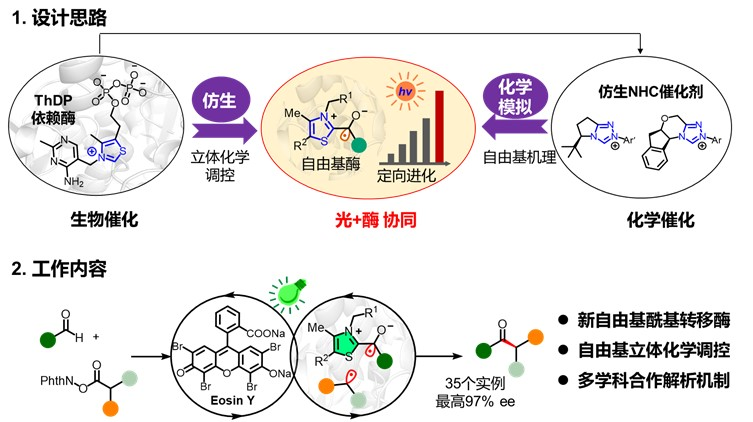 在自然界中,焦磷酸硫胺素依赖的苯甲醛裂解酶,催化的是双电子的(可逆的)苯甲醛到安息香的转化。受这一类酶的启发,合成化学家发展了一系列仿生氮杂环卡宾催化剂,并于近期用于催化自由基反应。综合利用仿生和化学模拟的思路(图1),研究团队利用可见光激发和定向进化手段,将ThDP依赖的苯甲醛裂解酶“重塑”为自由基酰基转移酶(RAT),实现了一例非天然的高对映选择性的自由基-自由基偶联反应。该成果首次将ThDP依赖酶用于催化非天然的自由基转化,同时实现了有机氮杂环卡宾催化不能达到的低催化剂负载量和高立体选择性的效果。