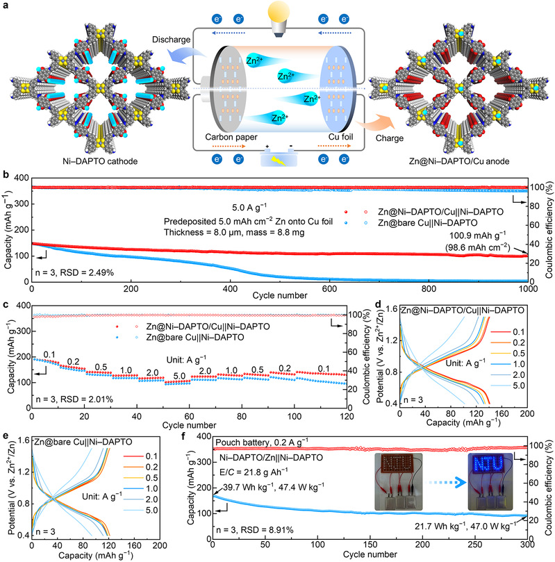 本研究提出了一种双功能共价有机框架(COF)材料——Ni–DAPTO,旨在解决水系锌离子电池(AZIBs)中的两大关键挑战:有机正极材料的低导电性和负极锌枝晶的形成。该材料的超低能隙及其Ni配位中心使其兼具高导电性和引导Zn2+离子均匀沉积的能力。因此,Ni–DAPTO表现出卓越的循环性能和稳定性,并在高倍率条件下展现出优异的倍率性能。更重要的是,在负极侧,Ni–DAPTO有效引导了锌的均匀沉积,显著提升了锌负极的循环稳定性和库仑效率。基于Ni–DAPTO的全电池和软包电池均表现出优异的循环性能,验证了该材料在实际应用中的巨大潜力。本研究通过利用有机材料,特别是通过精确结构编辑构建多功能模块化结构,为能量存储提供了一种新思路。这一策略有望推动水系可充电电池技术的创新与发展。